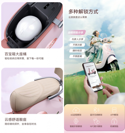 4G智能互联系统支持多种解锁方式——蓝牙无感解锁、APP远程控制、NFC刷卡等,妈妈再也不用在包里翻找钥匙。远程启动、座桶解锁、骑行轨迹查询等功能,也都让日常用车变得轻松优雅。
