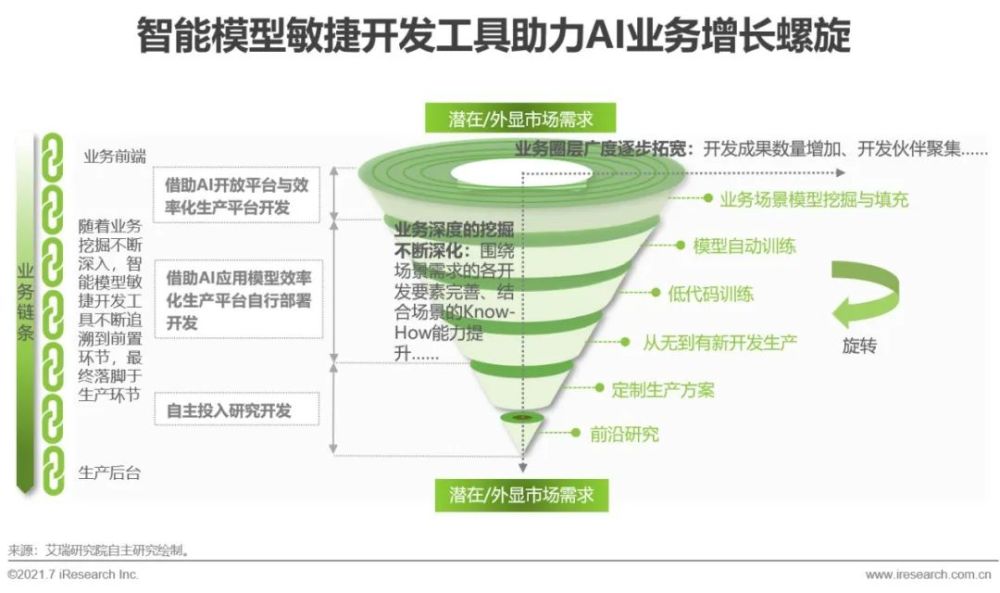 在人工智能产业发展的过程中,智能模型敏捷开发工具可持续拓宽与深挖AI业务的广度和深度。从广度讲,AI开放平台形成平台效应,调用平台API的开发者聚集创新,针对不同业务场景的开发成果数量逐渐增多,提高了技术产品的利用率,打造出轻量化的输出模式、降低单位开发成本,并且构建出动态更新的服务池;与此同时,一站式AI应用模型效率化生产平台逐步填充因场景多元化而衍生出的长尾业务模型,丰富模型供应市场的种类与数量。从深度讲,二者均从业务前端发掘潜在或外显的市场需求,针对刚需应用与高价值环节延伸出多条增量建设与运行需求业务线,瞄准市场风口的同时,敏捷、经济地消化个性化或碎片化需求,根据需求柔性匹配生产。