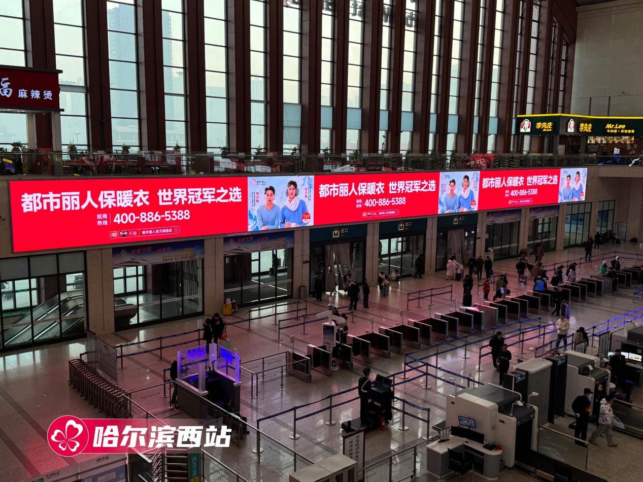 2025年春节,都市丽人敏锐捕捉亚冬会赛事热度与春运返乡潮的双重机遇,以高铁场景为核心支点,构建“线下超级曝光+线上社交裂变”的双轮驱动模式。春运期间,全国铁路发送旅客超5亿人次,高铁站日均人流量突破千万,都市丽人聚焦北京南站、郑州东站、哈尔滨西站等北方核心枢纽,重金投入高铁1屏超级巨幕,通过“国民品牌+世界冠军”的黄金组合,打造全景式品牌传播生态。